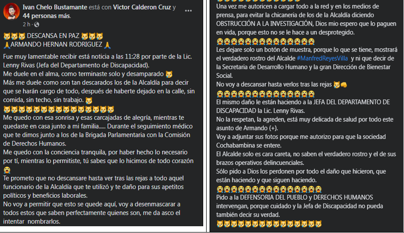 Fue muy lamentable recibir está noticia a las 11:28 por parte de la Lic. Lenny Rivas (Jefa del Departamento de Discapacidad). Me duele en el alma, como terminaste solo y desamparado, más me duele como son tan descarados los de la Alcaldía para decir que se harán cargo de todo, después de haberte dejado en la calle, sin comida, sin techo, sin trabajo.
