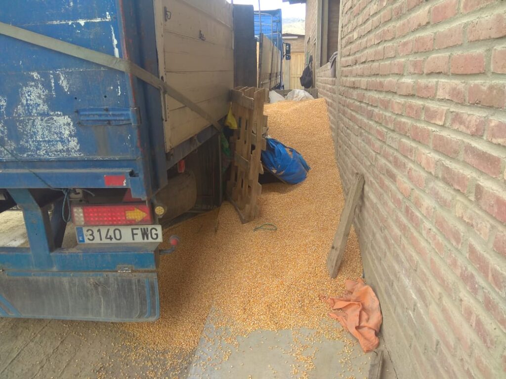 Un camión de alto tonelaje se encontraba estacionado al interior de una granja con quintales de maíz para las gallinas, fue así que los trabajadores se reunieron para descargar dicho producto.