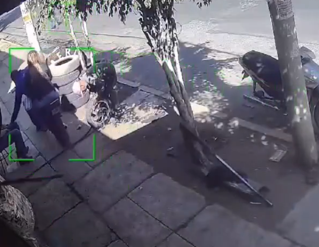 En las imágenes se ve como la pareja llega hasta la puerta de una tienda donde hay una joven atendiendo, desde el inicio el conductor observa todo a su alrededor, principalmente a quien se encuentra frente a ellos.