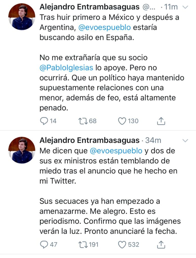 El periodista español Alejandro Entrambasaguas, lanzó el 6 de agosto, un anuncio de alta sensibilidad política, pues asegura tener fotografías del exmandatario Evo Morales con mujeres menores de edad, las que publicará en los siguientes días.