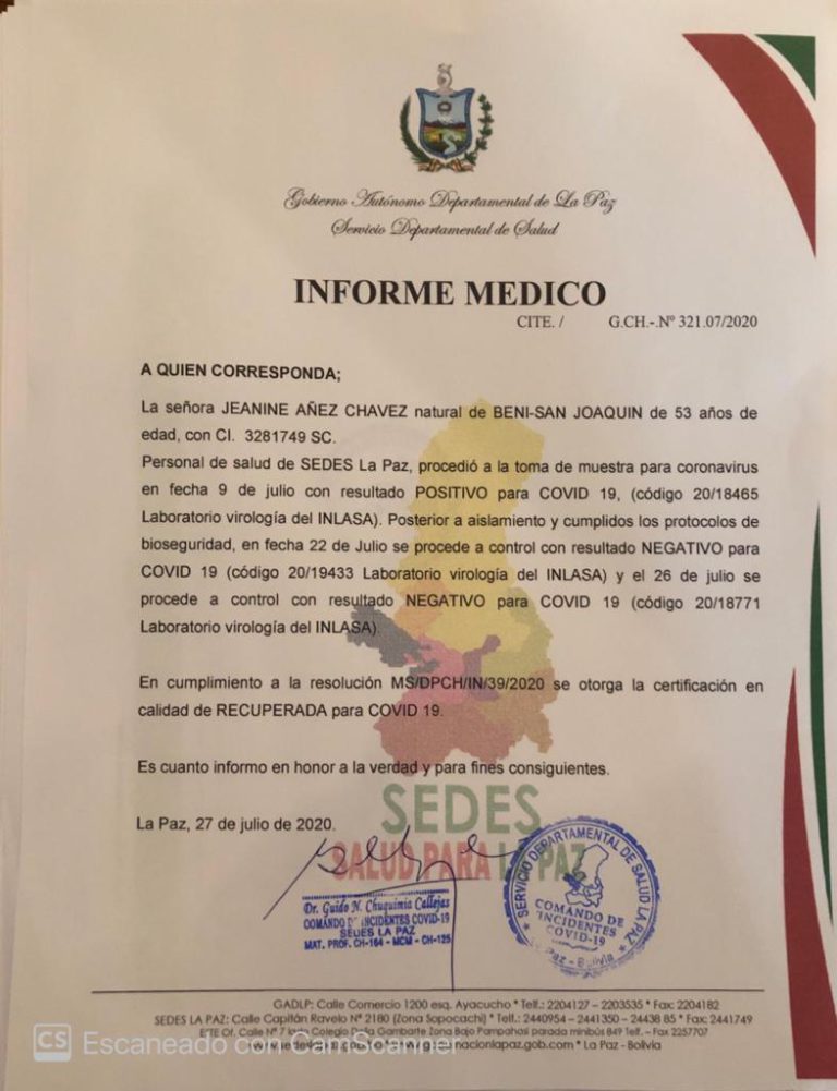 Este lunes 17 julio, la presidenta Áñez anunció que ya venció la enfermedad: