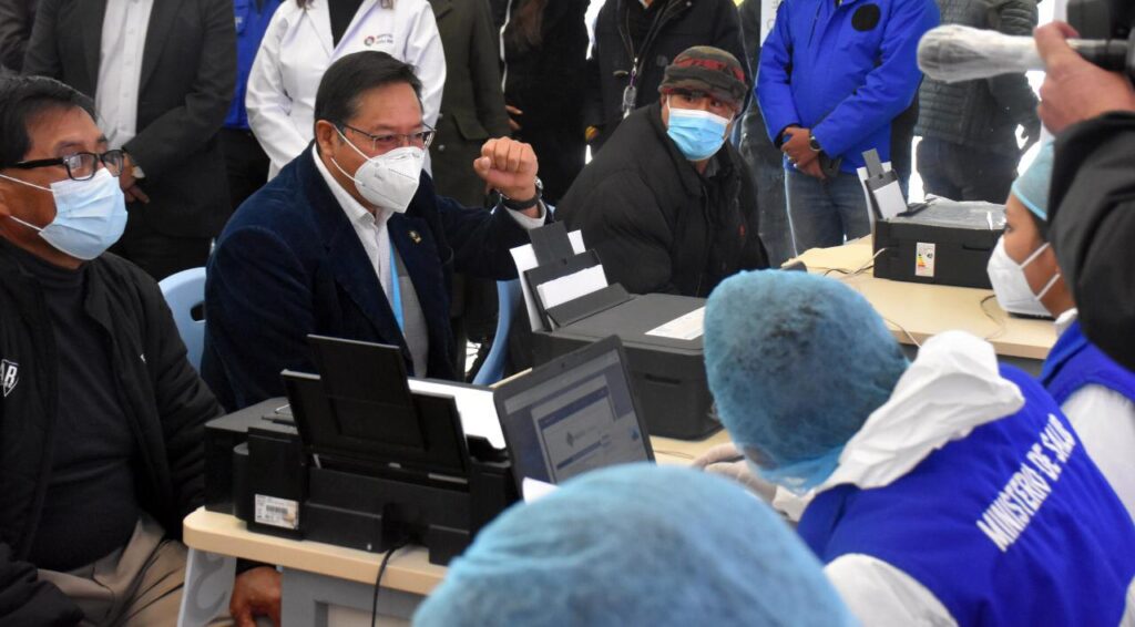 Al concluir el proceso, el Jefe de Estado tuvo un breve encuentro con los medios de comunicación y convocó a la población boliviana a acudir a los puntos de inmunización para recibir las dosis de la esperanza.