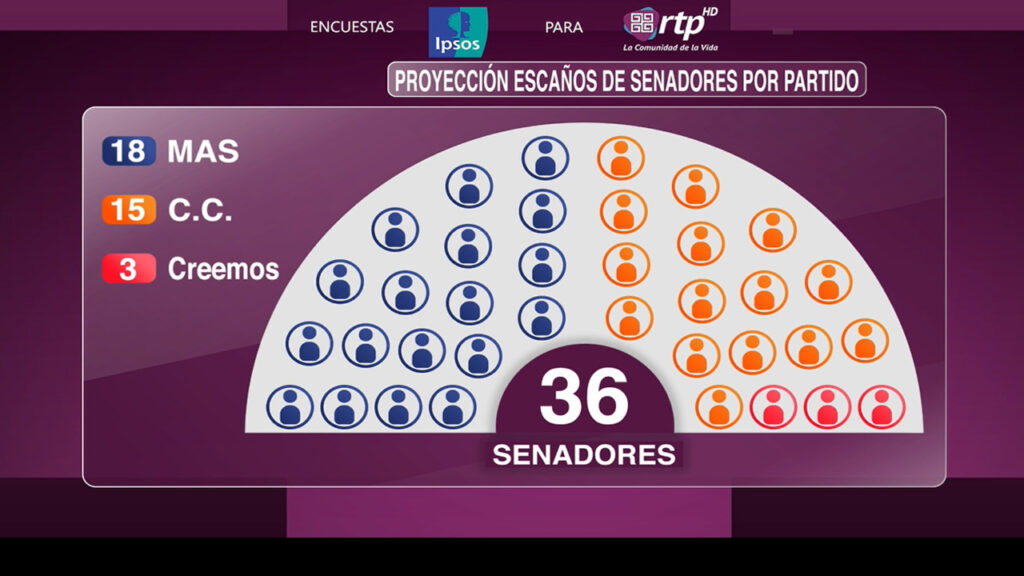 De acuerdo con las proyecciones realizadas por la empresa encuestadora, el MAS se quedaría en el Senado con 18 de los 36 curules, Comunidad Ciudadana (CC) obtendría 15 senaturías y Creemos, tres.