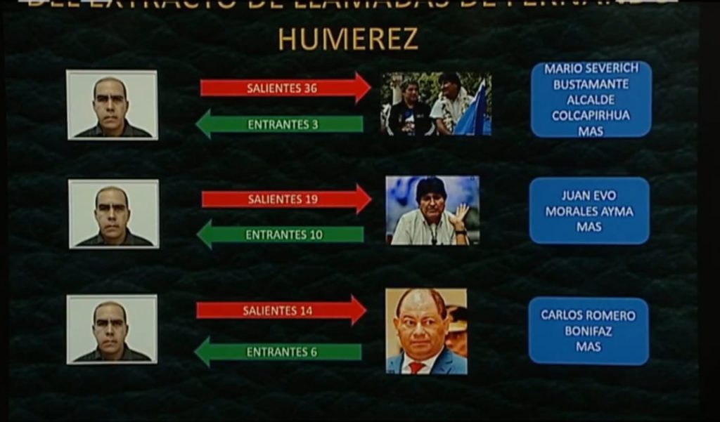 La Policía ha detectado 5.800 llamadas realizadas por Humérez a distintas personalidades. Se resaltan dos hechos importantes. Humérez llamó en 19 ocasiones al expresidente Evo Morales, mientras que el exmandatario respondió en 10. Las comunicaciones se realizaron hasta el 4 de mayo. En 14 oportunidades, Humérez llamó al exministro CarlosRomero y él le respondió seis veces. La Policía informó que todas fueron antes de que Romero sea detenido y encarcelado. Agencias