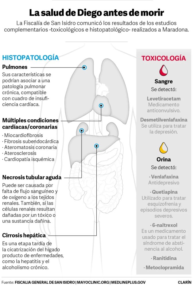 A un poco más de un mes del último adiós, estudios complementarios revelaron un escenario clínico de alta complejidad. Especialistas consultados por el periódico Clarín coinciden en que los informes toxicológicos e histopatológicos hablan de un organismo deteriorado por múltiples causas y de larga data.