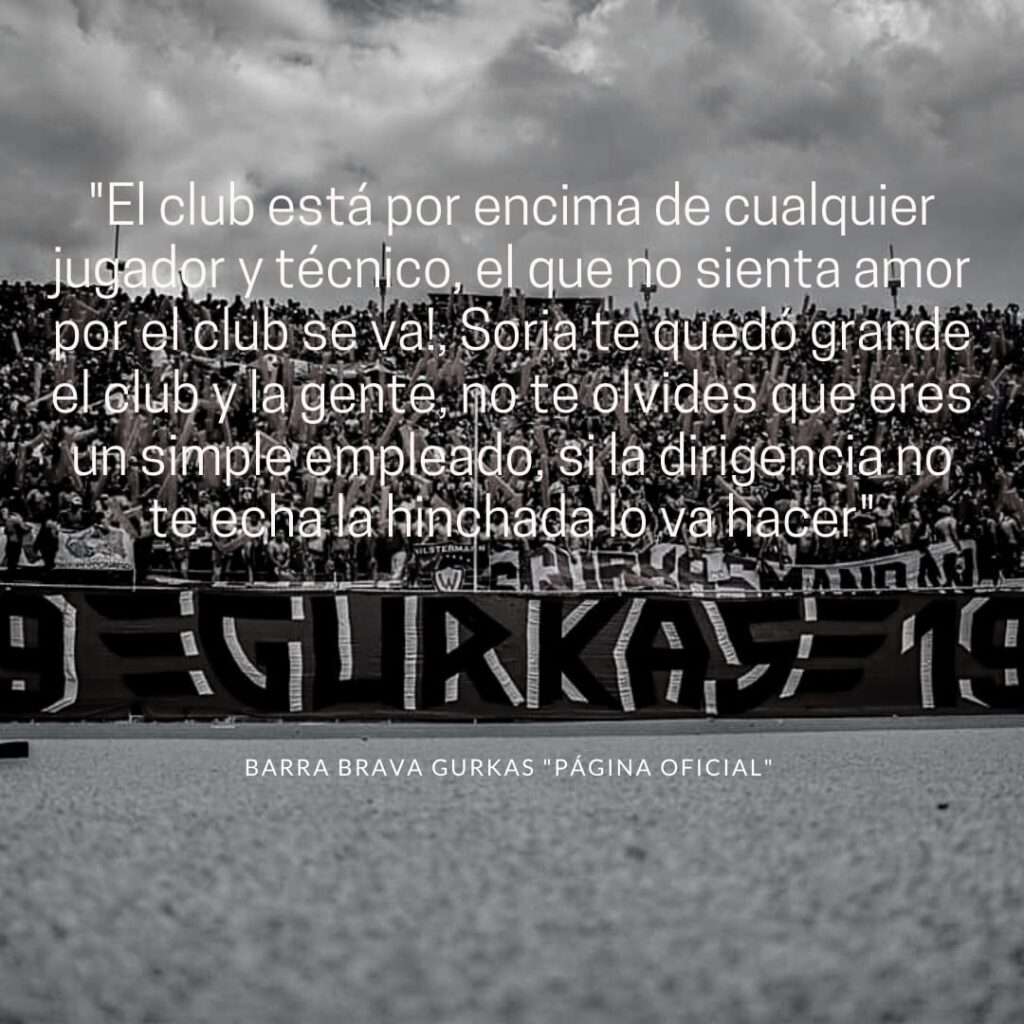 La Barra Brava Gurkas mediante su cuenta de Facebook oficial decidió pronunciarse y apuntó contra el técnico Soria y la dirigencia del club.