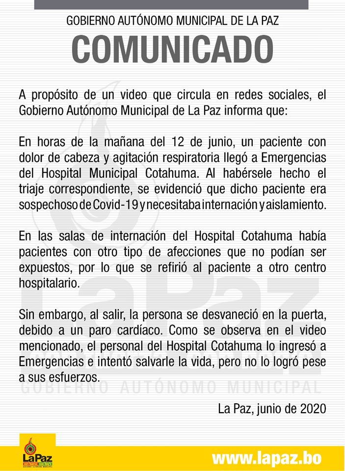 «En horas de la mañana del 12 de junio, un paciente con dolor de cabeza y agitación respiratoria llegó a Emergencias del Hospital Municipal Cotahuma. Al haberse hecho el triaje correspondiente, se evidenció que dicho paciente era sospechoso de COVID-19 y necesitaba internacion y aislamiento», dice el comunicado del municipio paceño.
