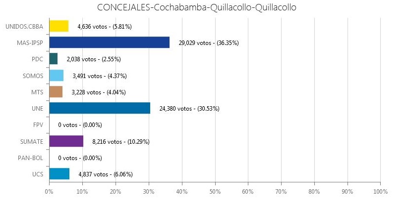 Con estos resultados la conformación del Concejo Municipal de Quillacollo seria la siguiente: 5 concejales para el Movimiento al socialismo, 5 concejales para UNE y un concejal para Súmate considerado como “el concejal de oro”, cuyo voto determinaría el desempate en las decisiones que tomara el ente deliberante.