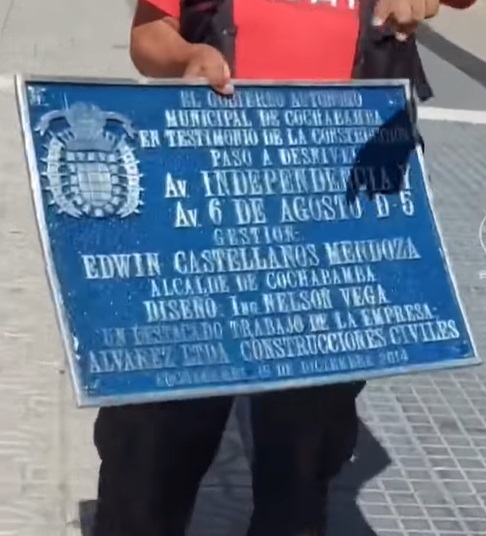 Uno de los vecinos del distrito 5, Rene Quispe, llegó hasta la plaza principal 14 de septiembre con la plaqueta del puente Independencia. Enojado y gritando, lanzó la plaqueta en puertas del Concejo Municipal de Cochabamba pidiendo la atención de las autoridades municipales.