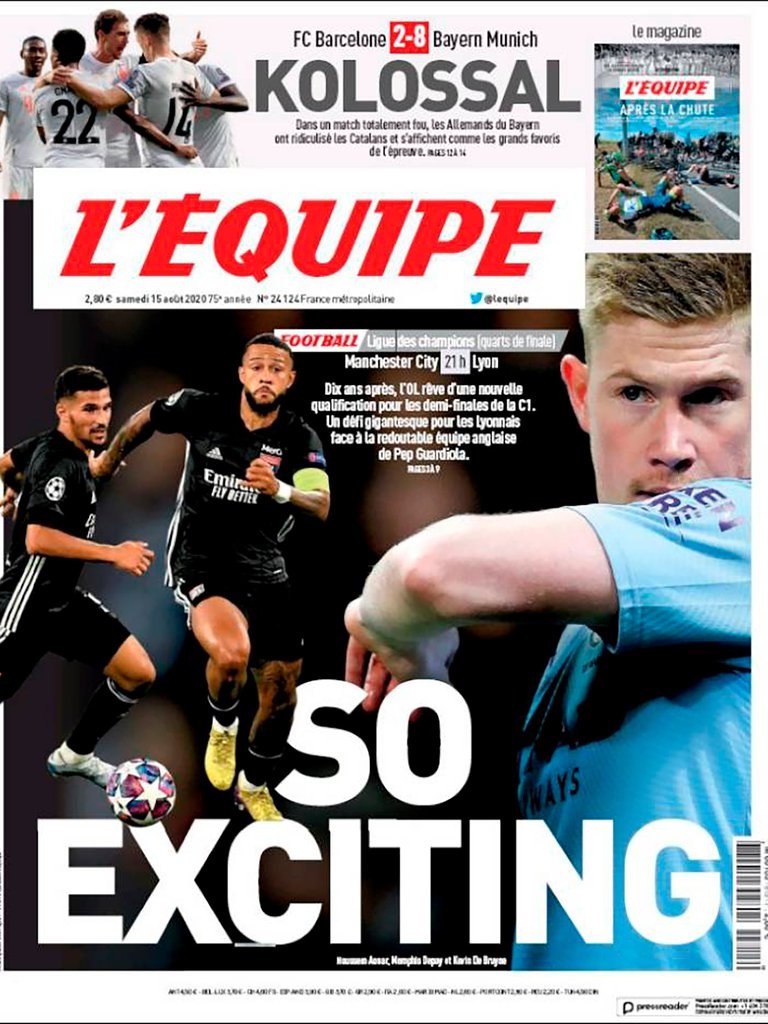 Más allá de la prensa española, el otro reconocido medio que se hizo eco del triunfo del Bayern en Lisboa fue L’Equipe, el periódico francés. Más allá que el tema central de su portada es la previa del duelo que esta tarde protagonizarán el Manchester City de Pep Guardiola y el Olympique Lyon, de Francia, en la parte superior de la tapa aprovecharon para comentar lo sucedido en el estadio Da Luz de la capital de Portugal. “Colosal”, fue el título elegido por el periódico francés, al mismo tiempo que remarcaron que el Bayern Múnich dejó en ridículo al Barcelona y que, gracias a la abultada victoria, se transformó en gran candidato para quedarse con el título.