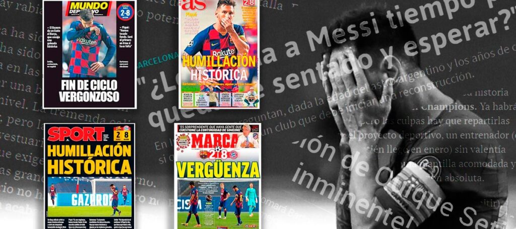 Así lo marcaron las tapas de los principales medios españoles. La prensa catalana remarcó en sus portadas el impacto de una derrota que dejará secuelas para la directiva que preside Josep Maria Bartomeu, para el entrenador Quique Setién y para la plantilla que lidera el capitán Messi. “Humillación histórica”, tituló Sport, que graficó la estrepitosa caída con una foto en la que se puede ver al número 10 del Barcelona con la cabeza baja.