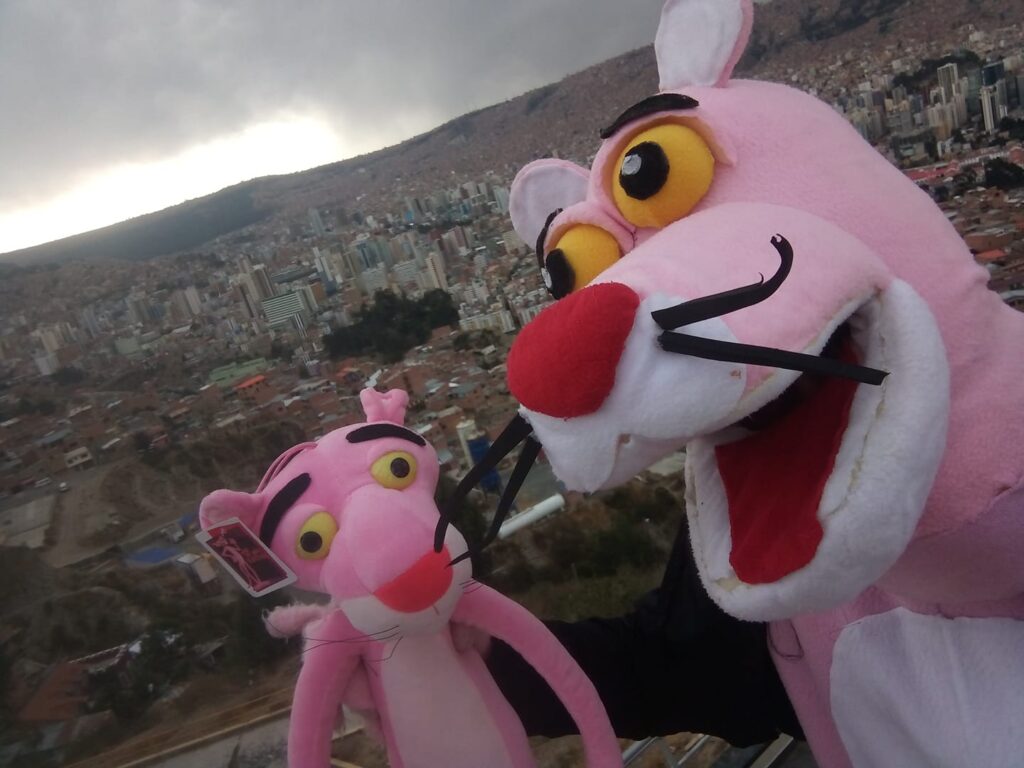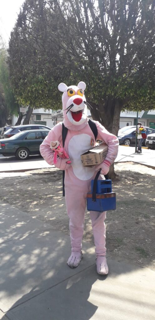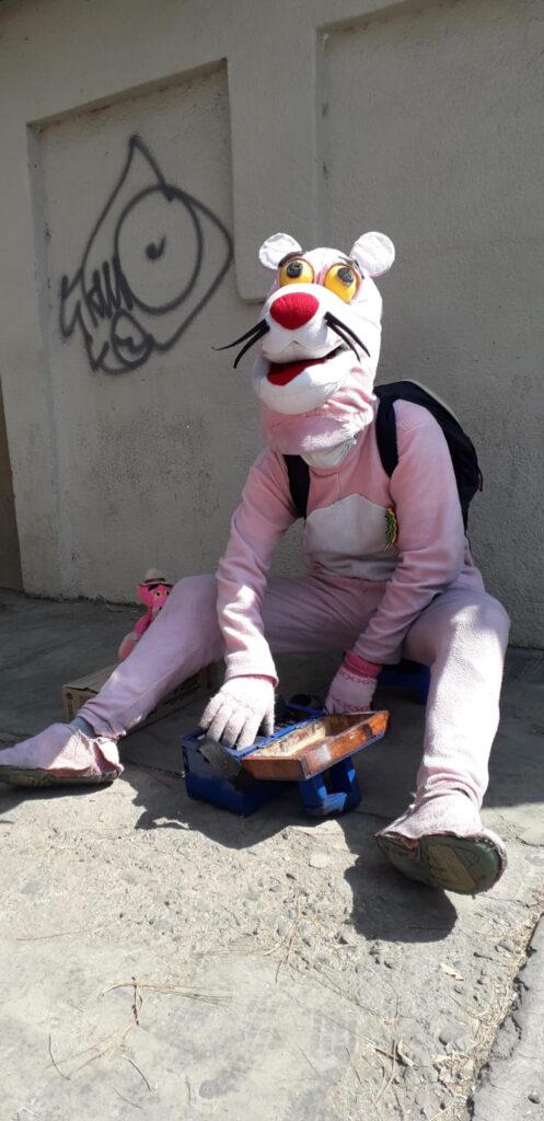Vestido de pantera rosa transita por las calles de Cochabamba hace 15 días, lleva consigo una cajita para lustrar zapatos, unas golosinas y dos peluches iguales a su traje, estos son sus únicos compañeros de trabajo en la Llajta.